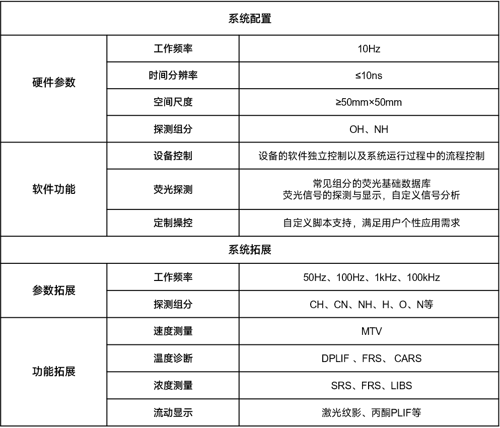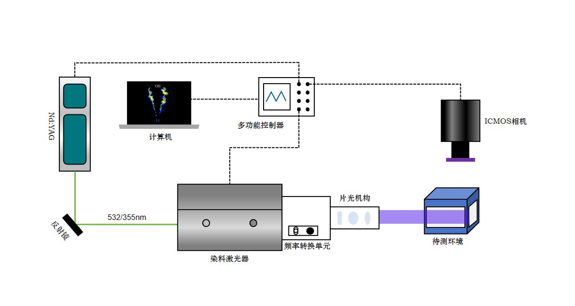 平面激光诱导荧光诊断系统(PLIF)是利用激光诱导荧光(LIF)技术实现物质分布探测的软硬件平台。它由专业的激光光源、精密的光学整形成像机构、高灵敏度的探测相机等设备以及完善的系统软件构成。该系统广泛应用于化学燃烧、等离子体等复杂环境,是这些领域内开展科学以及应用研究的重要工具。PLIF系统常见的诊断目标有OH、CH、NO等分子,结合分子辐射光谱理论以及其他辅助手段,PLIF技术还可用于温度、浓度、速度等参数的定量测量研究。